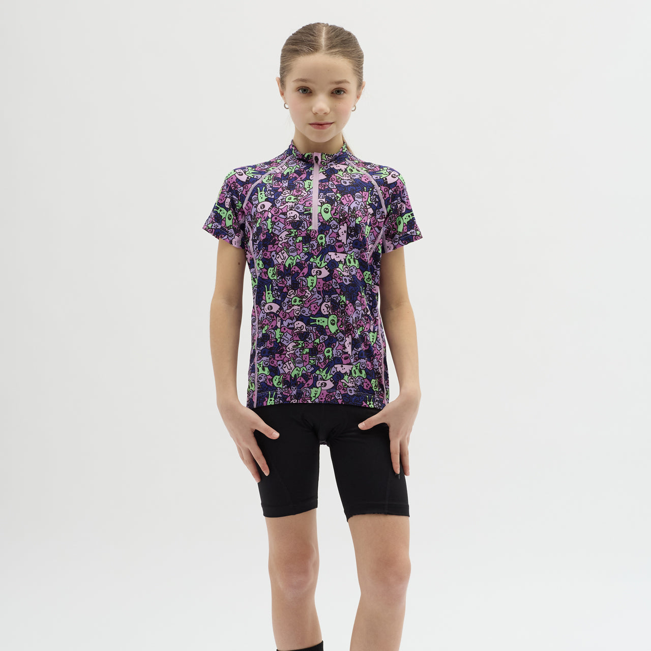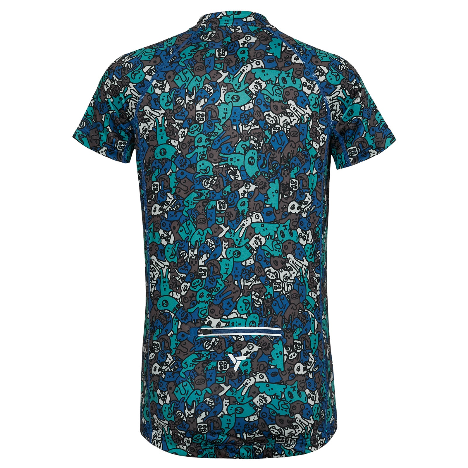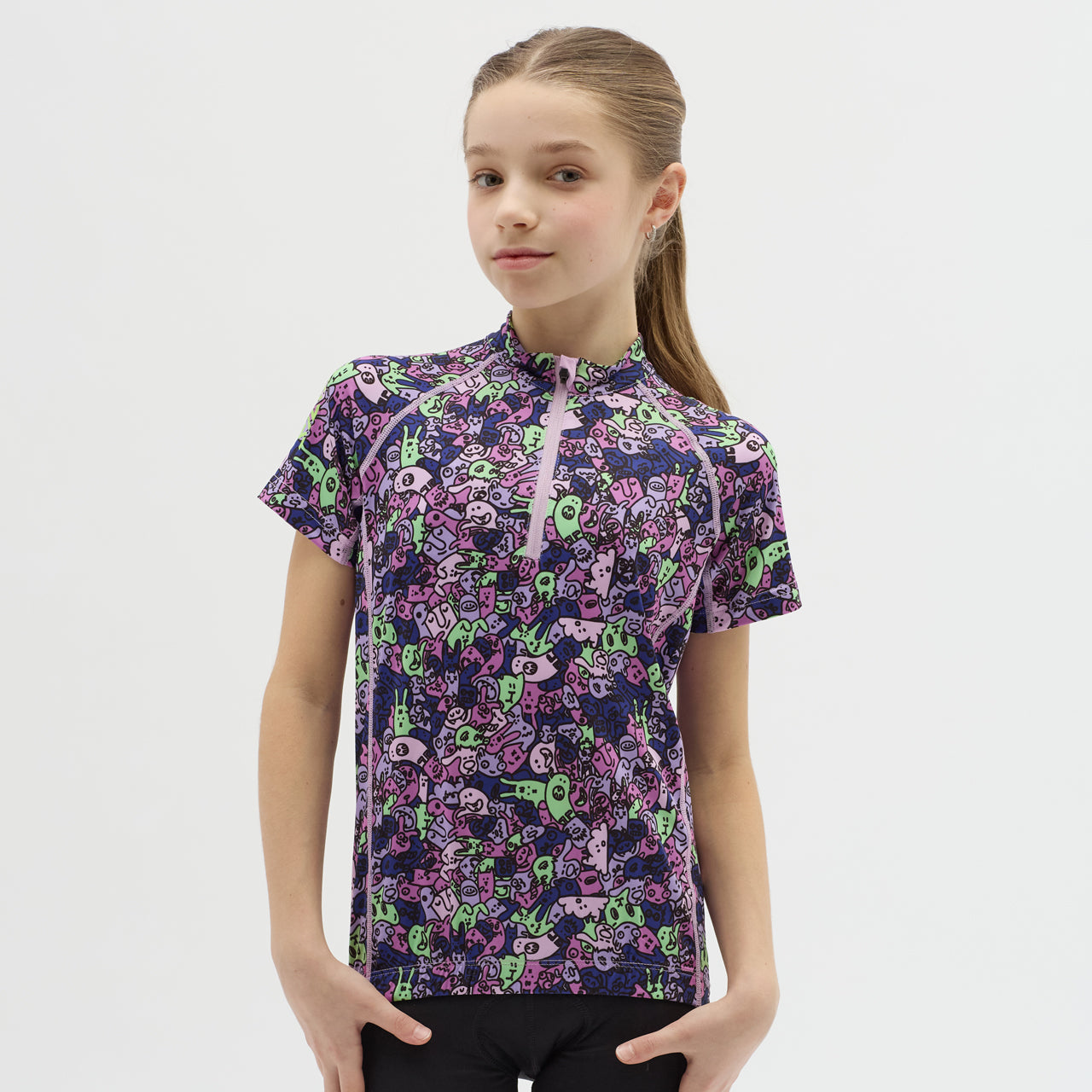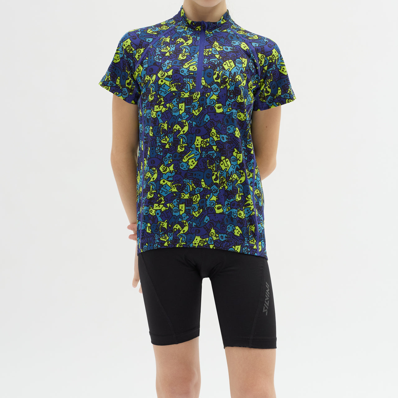 Children's cycling jersey made of breathable and elastic Light MESH material with a short front zip. On the back extended part there is a zipped pocket, silicone elements. There are safety reflexes on the jersey.