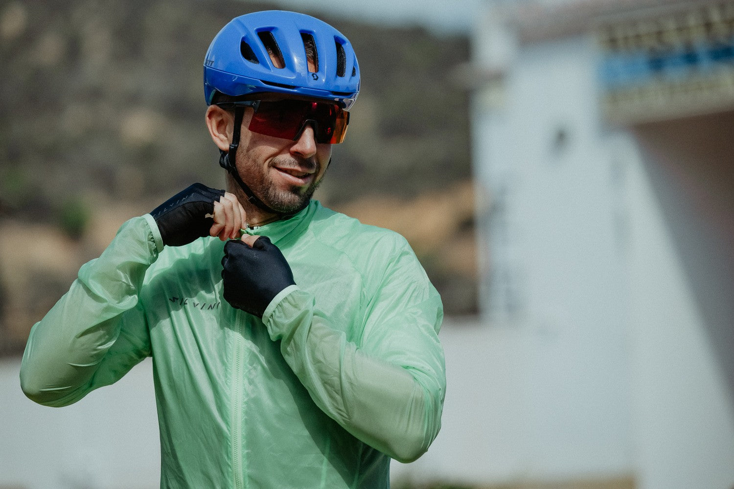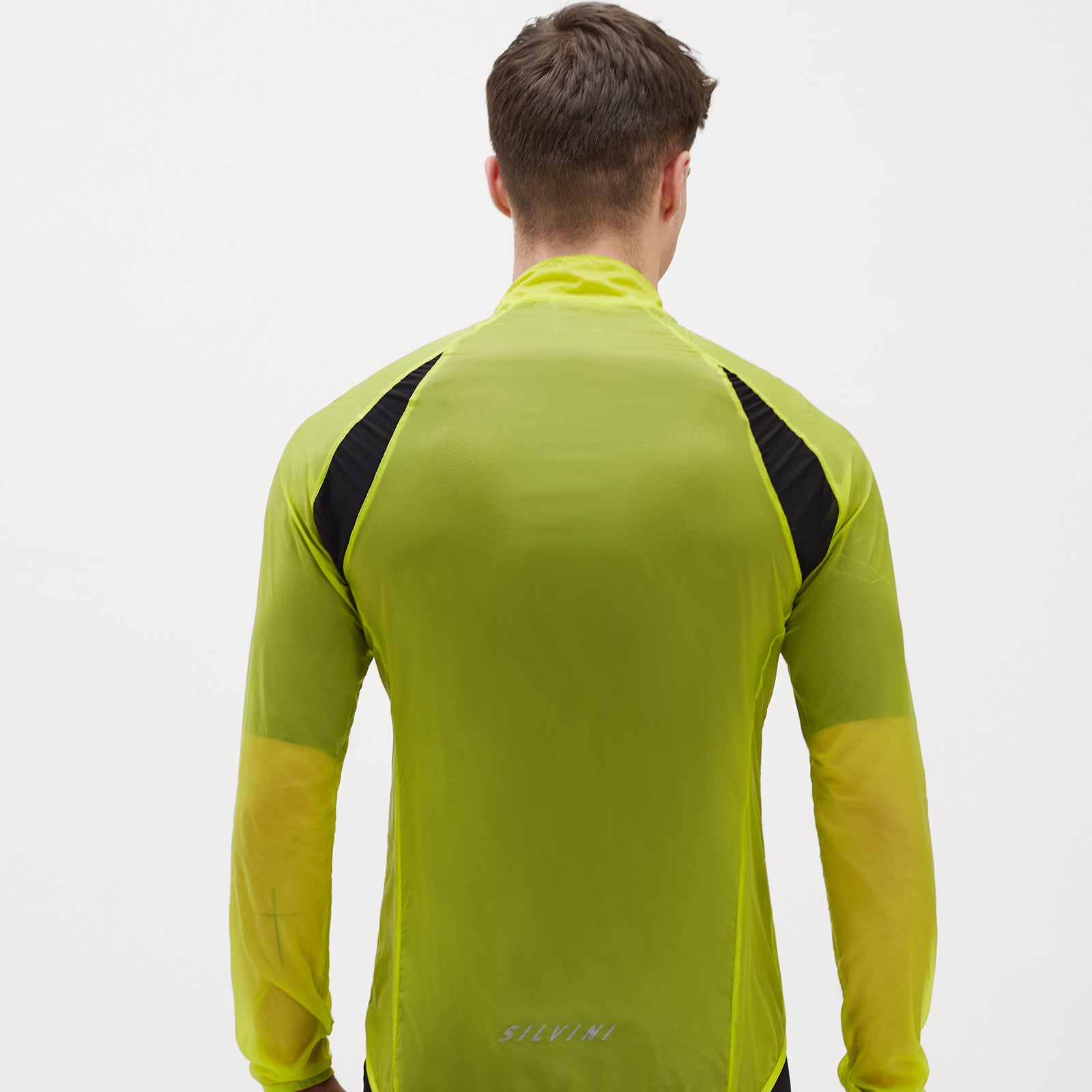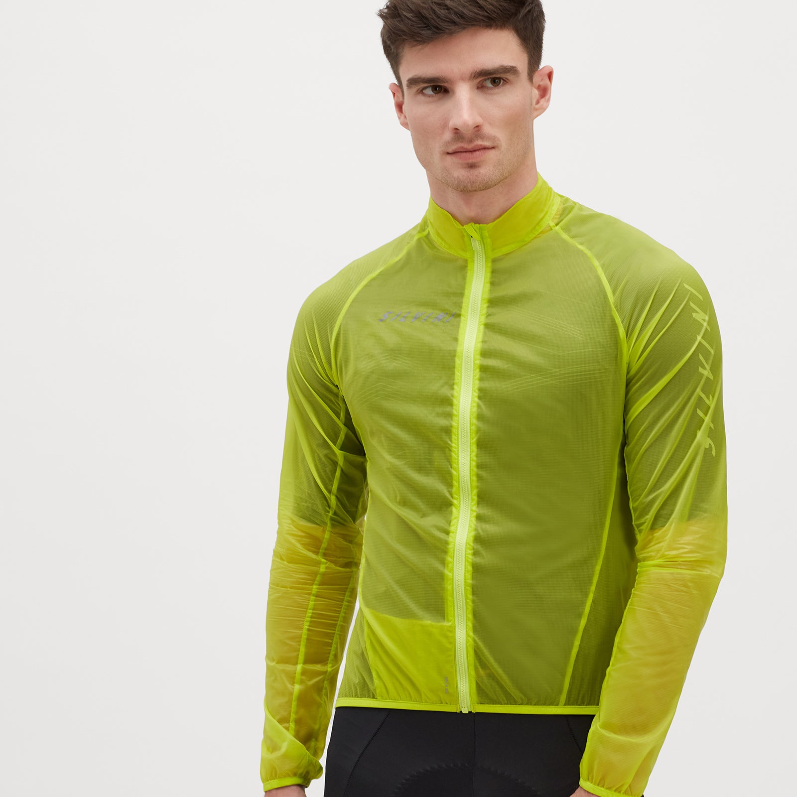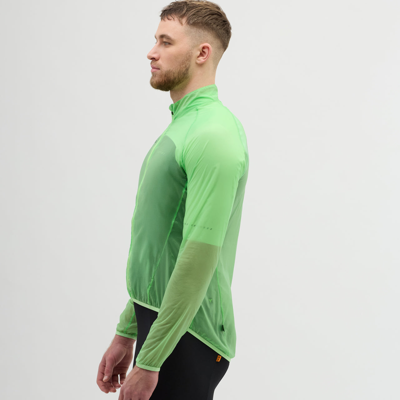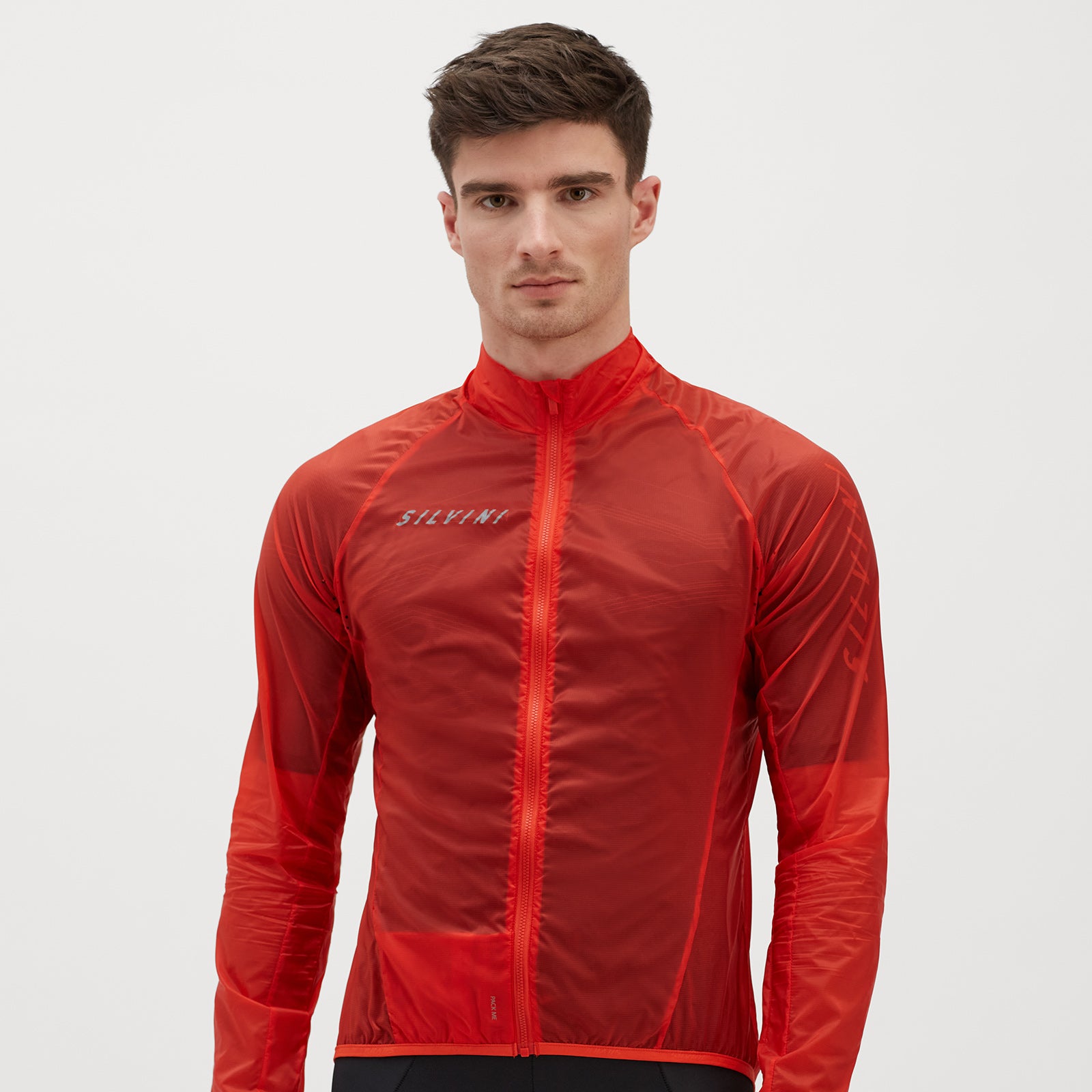 Men's ultra-light cycling jacket made of windproof but breathable Windbreaker material. It has an extended back with a non-slip hem, a perforation in the armpit and is easy to pack into the front pocket.