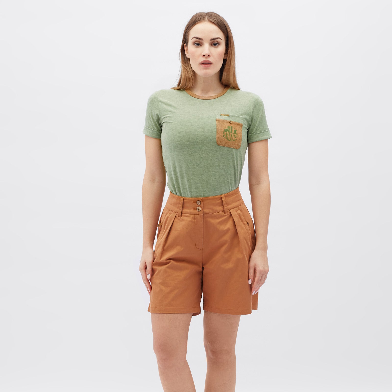 The Calvisia women’s T-shirt is designed for everyday wear in the city as well as for leisure activities. It is made from soft recycled fabric with a high modal content, providing a pleasant feel, excellent breathability, and stretch for maximum comfort during movement. The T-shirt features short sleeves and a relaxed fit, offering freedom of movement throughout the day. For practical storage of small items, it includes a pocket with decorative reflective details on the chest and back, which also adds a modern design touch. The bottom hem is finished with a small decorative faux-leather loop, giving the T-shirt an elegant detail. The extended back ensures optimal coverage and comfort while sitting, bending, or during other activities. Combining functionality, comfort, and stylish design, the Calvisia T-shirt is an ideal choice for women looking for a practical, comfortable, and modern T-shirt suitable for city life and leisure activities.