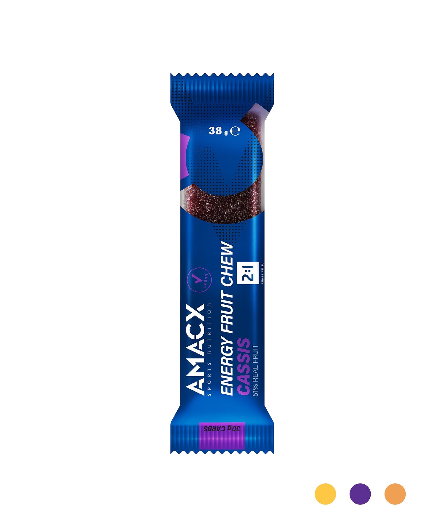 The Energy Fruit Chew, formerly known as the Amacx Turbo Fruit, is a candy composed of a specially developed and improved ratio of glucose and fructose carbohydrates (2:1). The two-to-one ratio of glucose and fructose ensures rapid carbohydrate absorption, supporting your energy supply (glycogen). Energy Fruit Chew is easy to carry and quick to eat, making it suitable for consumption during exercise. Available in Cassis, Orange, and Piña flavours.
